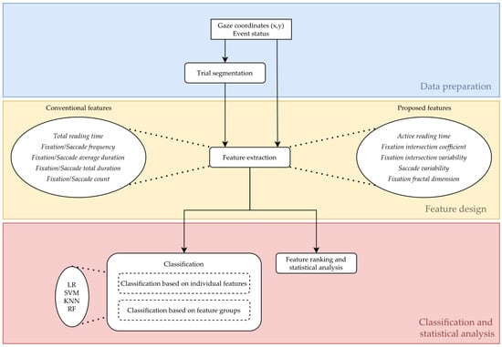 The nine conventional eye-tracking metrics used as features for classification were: Fixation count, Saccade count, Fixation frequency, Saccade frequency, Fixation average duration, Saccade average duration, Fixation total duration, Saccade total duration, and Total reading time [42].