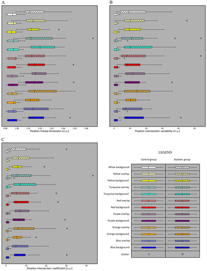 The boxplots of (A) Fixation intersection coefficient, (B) Fixation fractal dimension, (C) Fixation intersection variability for each color configuration and two subject groups (dyslexic and control).