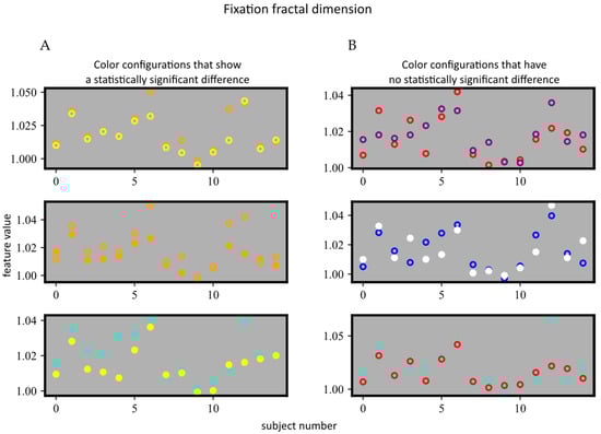 The visualization of data for all dyslexic subjects, for the three color configurations that (A) show a statistically significant difference and (B) show no statistical difference. Dots represent the background color configurations, and circles represent the overlay color configurations.
