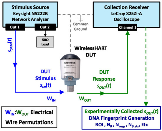 The experimentally collected signals used here for demonstration were originally collected in support of work reported in [19] using the setup shown in Figure 1. The basic setup was adopted from integrated circuit anti-counterfeiting work originally developed and demonstrated in [21] and includes three main hardware elements: (1) a Keysight N5222B PNA microwave network analyzer [27] used to provide the DUT input stimulus , (2) a LeCroy WaveMaster 825Zi-A oscilloscope [28] used to collect the DUT output response , and (3) a WirelessHART adapter serving as the DUT. The N5222B source parameters were set to produce the SFM stimulus signal which was power divided and input as to 1-of-5 available DUT wires denoted as for j∈{1, 2, …, 5}.