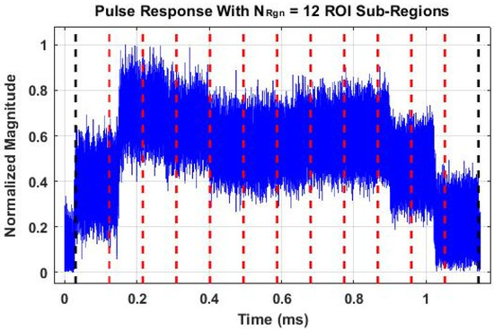 A Region Of Interest (ROI) within {sOut(n)} is selected and the corresponding instantaneous {Μ(n)}, {Θ(n)} and {Φ(n)} response sequences are divided into NRgn subregions for statistical feature calculation. This is illustrated in Figure 3, which shows the {Μ(n)} magnitude response for the representative pulse shown in Figure 2. Considering the calculation of three statistics (variance, skewness and kurtosis [30]) using samples within each of the NRgn = 12 indicated subregions, and across all samples within entire ROI as well, the time domain fingerprints include a total of NFD,TD = (12+ 1) × 3 × 3 = 117 features when accounting for the three instantaneous {Μ(n)}, {Θ(n)} and {Φ(n)} response sequences.