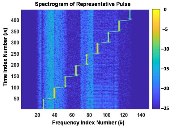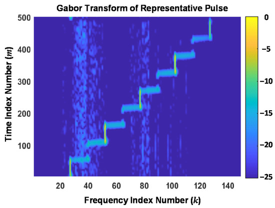 The utility of Gabor transformation for highlighting transients and localizing energy concentration is evident by comparing the conventional spectrogram response in Figure 4 with the Gabor transform response in Figure 5. These responses are shown using the same color bar scale (dB) and were generated using the representative SFM response used for Figure 3. The Gabor transform response was generated using a window width of Wτ = 1 × 10−3, NΔ = 460, MT = 500, and MF = 500 for a resultant (MT × NΔ)/MF = 460. As implemented here, the transformation for MF = 500 > NΔ = 460 represents oversampling conditions, which are generally desirable when processing noisy data [31,33].