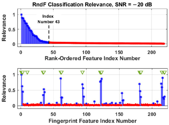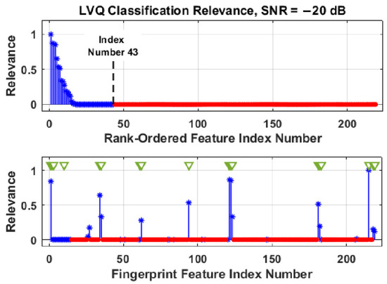 The DRA feature selection process is illustrated in the stem plots provided in Figure 7 and Figure 8. These plots show post-classification RndF and LVQ relevance metrics for the NFD = 219 full-dimensional feature set at SNR = −20 dB. The SNR conditions are noted given that feature relevance and DRA selection are generally SNR dependent, with a greater number of features becoming increasingly relevant as SNR decreases. The post-classification NDRA = 43 selected features are denoted by blue asterisk (∗) markers and the remaining least relevant 176-of-219 features are denoted by the red dot (●) markers. The 43-of-219 selection represents an approximate 80% reduction.
