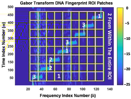 The ROI overlay in Figure 6 was generated using NTimBlcks = 8 and NFrqBlcks = 9, with a total number of NTim = 55 and NFrq = 12 indices defining the block time-frequency extent. Thus, there are a total of NPtch = 8 × 9 = 72 total time-frequency patches with each patch containing a total of 55 × 12 = 660 elements. Fingerprint statistics (variance, skewness, and kurtosis statistics [30]) were calculated using elements within each of the NPtch = 72 patches, and across all ROI elements as well, such that the resultant Gabor transform DNA fingerprints included a total of NFD-GT = (72 + 1) × 3 = 219 statistical features.