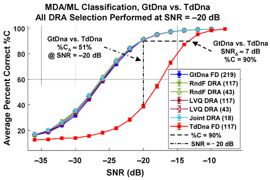 Composite MDA/ML classification performance for NCls = 8 devices using indicated feature sets. GtDna feature improvement is indicated by an SNRΔ = SNRGT − SNRTD ≈ 7 dB “gain” at %C ≈ 90% and %CΔ = %CGT − %CTD ≈ 51% improvement at SNR = −20 dB.