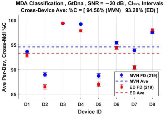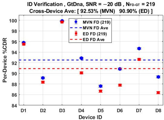 Per-device ID verification performance for full-dimensional NFD-GT = 219 features using the NMdl = 56 MDA models used for generating %C results in Figure 11. Results generated under SNR = −20 dB conditions using ED (■) and MVN (●) measures of similarity.