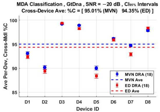 Per-device MDA classification performance for the NMdl = 56 models in Table 2. Results are for jointly selected NDRA-GT = 18 features generated under SNR = −20 dB conditions using ED (■) and MVN (●) measures of similarity.