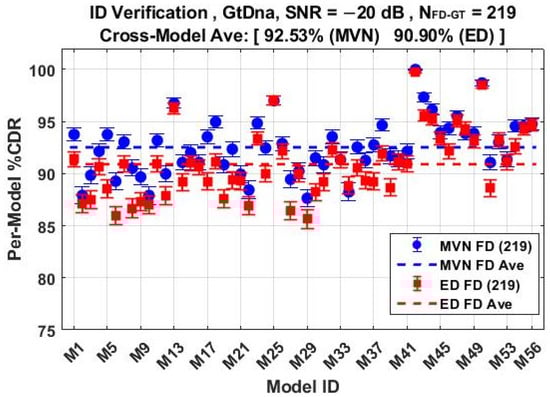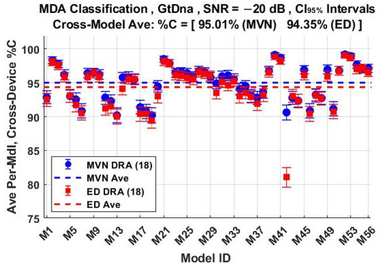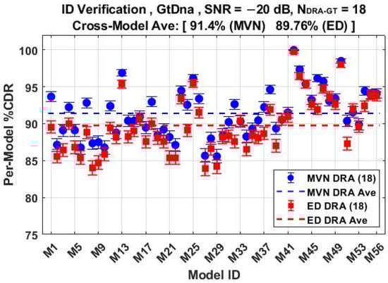 Per-model ID verification performance for jointly selected NDRA-GT = 18 features using the NMdl = 56 MDA models used for generating %C results in Figure 14. Results generated under SNR = −20 dB conditions using ED (■) and MVN (●) measures of similarity.