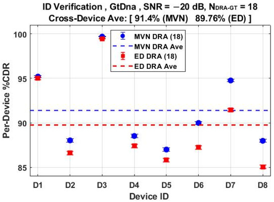 Per-device ID verification performance for jointly selected NDRA-GT = 18 features using the NMdl = 56 MDA models used for generating %C results in Figure 13. Results generated under SNR = −20 dB conditions using ED (■) and MVN (●) measures of similarity.