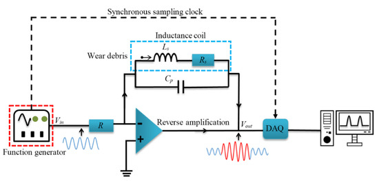 Contrastingly, in the HFVA method, the debris is detected by measuring the output voltage directly. Without the need for data conversion, the response time of the detection equipment is greatly shortened, which makes the system more sensitive. Figure 1 shows the signal detection system of HFVA. The sensing circuit is composed of a voltage follower, a gain inverting amplifier, and a sensing coil. The sensing coil is connected with capacitance in parallel to form a parallel resonance circuit. Except for the sensing circuit, the whole detection system also contains a function generator, signal acquisition equipment (DAQ), and a computer. The function generator produces a sine wave excitation signal, which is applied to the sensing coil after passing through the voltage follower. When a particle passes through, the output voltage amplitude will increase. Finally, the peaks of the output signal are recorded in real time with the high-frequency synchronized sampling method [49,50,51,52]. The recorded data are processed with the digital low-pass filter in LabVIEW and saved to the computer. The relationship between the output voltage, Vout, and input excitation signal, Vin, is shown in Equation (1):
