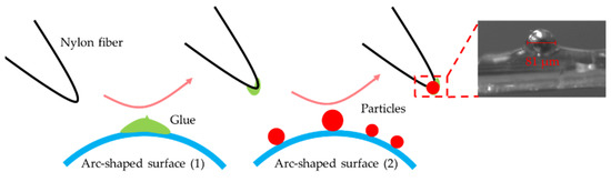 In our work, particles were bonded to nylon fibers. The advantages of this method are as follows: Firstly, the velocity of the nylon fibers and particles is synchronous. We can control the velocity of the particles accurately by controlling the nylon fibers. Secondly, the particles are bonded to the fibers after accurate measurement, which can ensure the accuracy of the measured particle size. Finally, the particles can be used repeatedly, which could eliminate the influence of samples during the experiments. The specific steps for sample preparation were as follows: As Figure 2 shows, the nylon fiber was firstly dipped into a small amount of glue on an arc-shaped surface. Then, a particle of the desired size on another arc-shaped surface was picked up by the nylon fiber with a small amount of glue. All steps above were carried out under the help of micromanipulation and a microscope.
