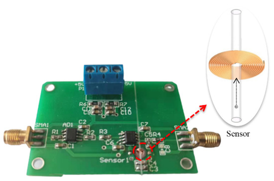 The overall design of the sensor and the circuit is shown in Figure 3. The sensor includes a straight micro-channel and a short micro-inductance coil. In order to make the particles move as straight as possible, keep the trajectory as constant as possible, and avoid hindering the flow of particles, a micro-channel diameter of 300 microns was used. The detection sensitivity of the sensing coil increases with the increase in coil turns, but decreases with the increase in the enameled wire diameter [10]. Therefore, we used a coil with 40 turns, an inner diameter of 600 μm, and an outer diameter of 1250 μm. The number of layers was 4, the number of windings per layer was 10, and the enameled wire diameter was only 50 μm. The coil was wound by an automatic hot air winder (Dongguan Yinzhuoen Precision Automation Co., Ltd., Dongguan, China). In addition, in order to observe the effect of the particles’ velocity on the detection results more clearly, a relative long coil axial length of 260 μm was adopted. The magnetic field inside the sensing coil was radially uneven, and the magnetic field distribution at the edge of the hole in the sensing coil was larger than that at the center [53]. Therefore, the micro-channel was placed on the inner wall of the coil, so that the detection area was in the region of the maximum magnetic field intensity. Finally, we connected the induction coil with capacitors to form a resonant circuit. The information of all components constituting the sensor and detection circuit is listed in Table 1.