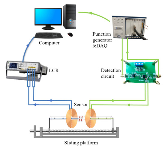 In the LCR method, a sensing coil was directly connected to the LCR meter (Keysight E4980A). The LCR meter applied a certain frequency of excitation voltage (2 MHz, 0.2 V) to the sensing coil and collected the output results in “MOD” mode. Then, the collected data were transmitted to the computer for further processing and output.