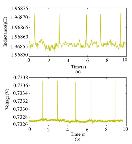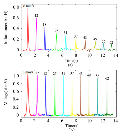 Figure 5a,b show the five measurement results of the iron particle at a velocity of 49 mm/s with the two methods, respectively. In Figure 5a, the signal was obtained using the LCR method. The maximum amplitude of the pulse in five repeated measurements was 1.96873 μH, while the minimum was 1.96872 μH. The maximum deviation of the signal pulses was 1 × 10−5 μH. The standard deviation was 0.00837 nH.