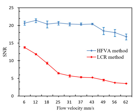 The SNR varied with the flow velocity under the two methods. With the LCR method, the SNR decreased with the increase in particle velocity. When the debris’ velocity increased from 6 mm/s to 62 mm/s, the SNR dropped by 74.36%. With the HFVA method, the SNR first remained stable with the increase in the particles’ velocity, and when the particles’ velocity rose higher than a certain value, the SNR began to slowly decrease. When the debris’ velocity increased from 6 mm/s to 62 mm/s, the SNR dropped by 21.52%.