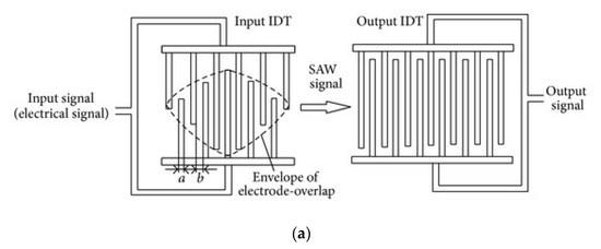 Fabrication of the SAW transducers is based on the thin metal films’ growth, by standard vacuum-deposition methods and direct- or reverse (lift-off)-lithography patterning, to shape the IDTs. In most of the cases, low-cost wet-chemical etching can be used as a final step of the photolithographic process [5]. If additional piezoelectric coating is needed in between or over the IDT electrodes, which is also formed by conventional processes such as vacuum RF sputtering, chemical vapor deposition (CVD), or spray coating (if the coating is organic) [6]. In this way, the large-scale production of the SAW elements is made compatible with the CMOS technology, except if the design is not based on the piezoelectric-crystal substrate. Then, a combination of microelectromechanical (MEMS) and CMOS technology is required to successfully integrate the SAW element and the integrated electronic circuits for signal-data processing [7]. In any case, the overall cost for fabrication of the SAW-based sensor devices is relatively low, as compared to other sensors relying on more precise and expensive microfabrication processes [8]. A common view of the SAW element with a piezoelectric substrate or coating is shown in Figure 1.