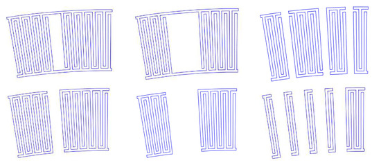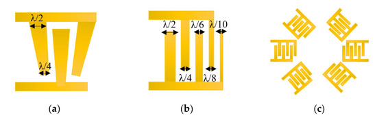 Irregular IDT configurations, which can be split or floating, have been applied to reduce reflection of the SAW toward the periphery of the substrate, out of the zone of the sensing-layer location [37]. The splitting period is related to the wavelength (respectively to the frequency) and can be calculated by sub-dividing the wavelength (Figure 5a). It is intended to suppress specific orders of harmonics, by keeping the ratio between the frequency and the width of the electrode fingers. The floating pattern means a specific number of electrodes in the sequence of fingers are to be disconnected from the common bus. In this way, higher working frequencies can be achieved without the need to decrease the width of the electrode fingers (Figure 5b). The delay line from Figure 5c is characterized by the gradually changing dimensions of the IDTs along the length of the line. The structure allows frequency modulation and a variety of available bandwidths, which is a very useful property for controlling the microfluidic flows in biosensors.