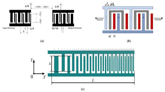 Modification in the period of the IDT: (a) split configuration; (b) floating-electrode configuration. Adapted with permission from Ref. [38]. 2017, Y.Q. Fu et al. [38]; (c) delay-line configuration. Adapted with permission from Ref. [39]. 2018, Dame Fall et al.