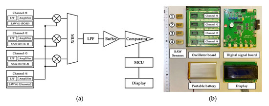A similar principle has been used in complex sensor systems where multiple analytes should be detected, therefore, multisensor arrays should be designed. The difference between the single and multiple sensing systems is in the presence of a multiplexor for switching between the separate channels (Figure 8). The system works in differential mode, comparing the measurement of a reference device with some of the other active channels. The system is equipped with a low-pass filter (LPF) and an amplifier, which at the same time plays the role of a buffer for impedance matching between the conversion and the computing parts, ensuring power conditioning and minimizing energy loss. The system was organized into two printed circuit boards, called the oscillator board (containing the SAWs and the battery power supply) and the digital-signal processing board (containing the rest of the electronic circuits).