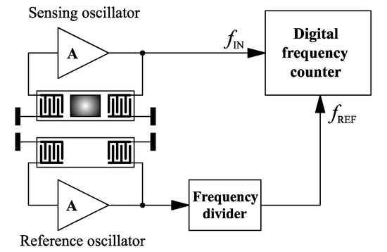 The circuit consists of two identical SAW sensors. The upper sensor has the gas-sensitive layer and is called “sensing”, while the lower sensor is without such a layer and is called “reference”. Every sensor is connected to a separate oscillator circuit. The output signals of the two oscillators are applied to an RF mixer, which generates the frequency difference between the two signals. This signal, after low-pass filtering, is applied to the frequency counter, which measures the frequency difference between the two channels. With this technique, the temperature and other changes in the resonant frequency are symmetrical in the reference and the sensing channels and do not produce a frequency change at the output of the mixer. At the same time, the frequency change due to the concentration of the measured gas is present only in the sense channel and is registered by the frequency counter at the output of the mixer [44].