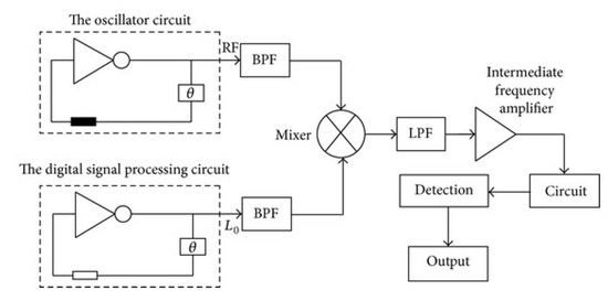 As is shown in Figure 11, sometimes there is an amplifier before the mixer as well as matching circuits rather than filters. The frequency-to-voltage converter consists of a phase-locked loop (PLL) and a differential amplifier. The output voltage is proportional to the input frequency necessary for the converter. The output voltage is then converted to a digital signal in the reading circuit.