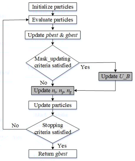 In this algorithm, the of particles are represented by a set, , and the mask is denoted by , given that each element in this set corresponds to an unmasked bit. The set is updated by obtaining information from the pbest of each swarm. A bit is removed from if it is not selected by all in the swarm. During the algorithm’s evolutionary phase, the set is updated. Some bits in are masked each time the mask- update mechanism is run. The mask-update approach ensures a reduced search space, because only the bits in can evolve. The position-updating mechanism can then be rewritten as in (11) [28].