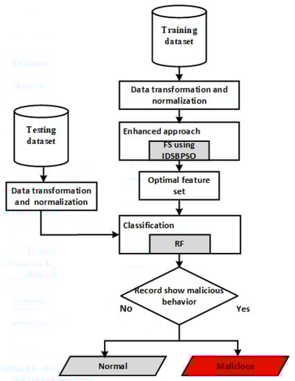 Figure 3 depicts the framework of the proposed model for a network IDS using IDSBPSO. The proposed system comprises a number of phases to obtain good accuracy and network suitability, as explained in this section.