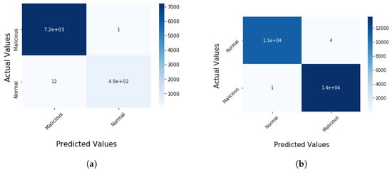Figure 4. Confusion matrix for binary classification. (a) IoTID20 dataset; (b) UNSW-NB15 dataset.