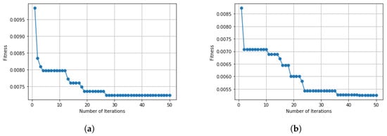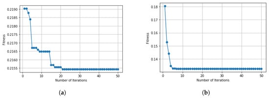 Figure 8. Convergence curve for multiclass classification. (a) IoTID20 dataset; (b) UNSW-NB15 dataset.Figure 9 subsequently shows the number of selected features from the total number of features in both the IoTID20 and UNSW-NB15 datasets. There are total 83 features in IoTID20 datasets out of which only 30 optimal features are selected for training the model. Similarly, in UNSW-NB15, there are total 42 features out of which 15 have been selected. Figure 10 then illustrate the random forest prediction time in the proposed model for both the binary and category classification of the IoTID20 and UNSW-NB15 datasets. As UNSW-NB15 dataset is larger as compared to IoTID20 dataset, therefore model takes more prediction time on it.