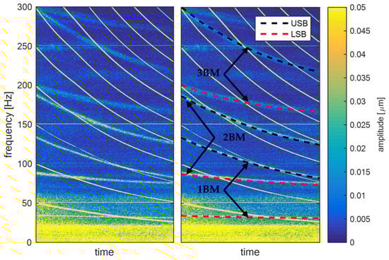 The illustrations of blade components are illustrated in Figure 2, where on the left is the spectrogram of shaft vibration signal measured in real operation of the low-pressure turbine. On the right is the same spectrogram with highlighted LSB and USB components related to the blade vibration for the first three bending modes (BM). From this Figure, the presence of blade vibration components is clear.