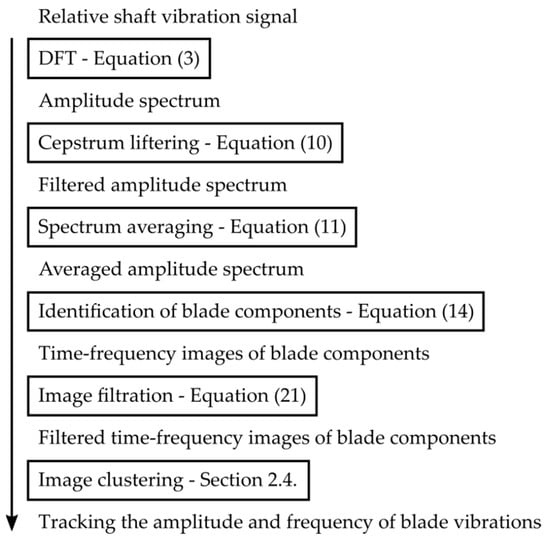 Firstly, the measured signal is pre-processed. This includes the signal filtering based on cepstral liftering and the spectrum time averaging in the spectral plane (flowchart in Figure 3) where the block schema of the proposed method is illustrated. The pre-processed signal is then analyzed and the blade components are identified, filtered in the time-frequency domain and clustered using the Euclidean distance. This algorithm is designed to run in a long-term perspective as a part of a remote monitoring system to track the natural blade frequency and corresponding amplitude automatically.