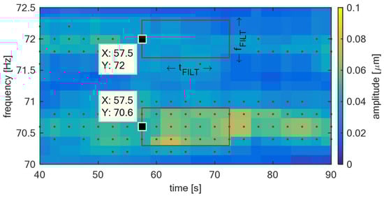 The example of this rectangle is illustrated for and in red in Figure 4. The meaning of the parameters and from this figure is evident—it is the time length and frequency length, respectively, of window rectangle . The red dots represent other identified according to the algorithm described in a previous part of this article. The filtration itself is defined according to Formula (21). The non-filtered is filtered if the number of in does not exceed the threshold . From Figure 4, it is obvious that becomes and not because . This process filters randomly excited noise components that can randomly occur during the measurement in the short-term, making this algorithm more robust and to ensure that false alarms are not generated.