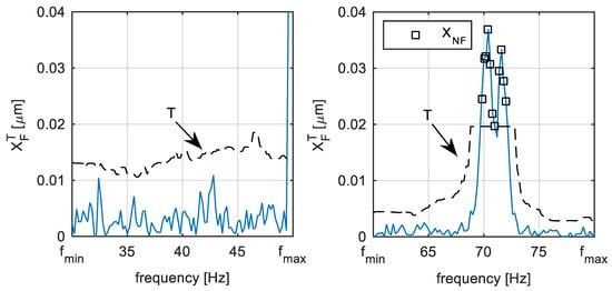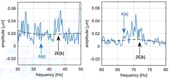 The example of the identification process is illustrated in Figure 8. There is the pre-processed signal of the shaft vibration in the form of an average amplitude spectrum, as it is illustrated in Figure 7. The dashed line represents the threshold defined in (17), that is in this case defined for and Hz. The black squares illustrate the identified components that exceed the threshold satisfying condition (16). It can be seen in Figure 8, that, if only the noise is present in the signal spectra monitoring range, there are no identified blade components and vice versa. The parameters should be set uniquely for each monitored frequency interval.