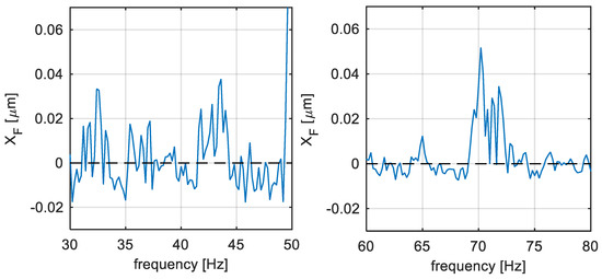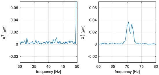 Time averaging described in Section 2.2 was applied to the measurement, which is illustrated in Figure 7 in the frequency domain. The DFT is then defined in time instants corresponding to (Equation (12)). The number of spectrums for averaging satisfies the condition , which means that the averaged spectrum characterizes 100 s of the relative shaft vibration signal.