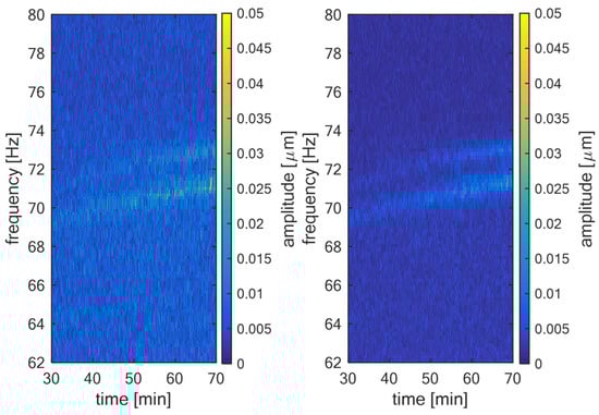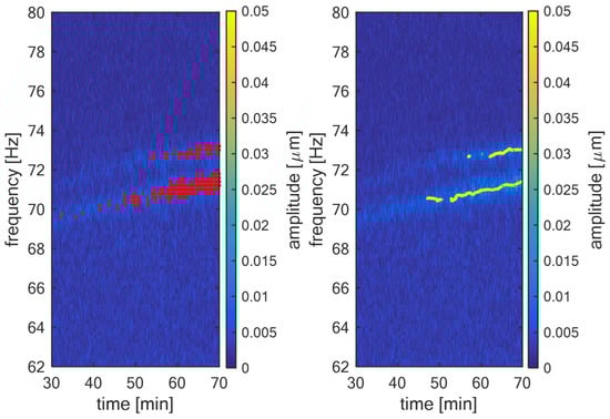 The example of the novel method for blade vibration monitoring that was described in this article is illustrated in Figure 9 and Figure 10. In Figure 9, left, there is the spectrogram of shaft vibration signal measured in the operation of TG 250 MW. The sampling frequency of the measurement was 10.24 kHz, the length of the Hanning window used in DFT was 5 s and was . It can be seen that the relative shaft vibration signal itself is noisy. In Figure 9, right, there is a spectrogram of the same signal section, but this time pre-processed according to Equation (11). It can be seen that the noise was filtered and the blade components that were approximately 71 Hz and 72.5 Hz are more obvious, even with the naked eye. The parameters for pre-processing were: , and , which corresponds to 15 s of signal for averaging. In fact, there are two blade components that increase their amplitude in time and also change their frequency because of the change in the steam turbine operating conditions.