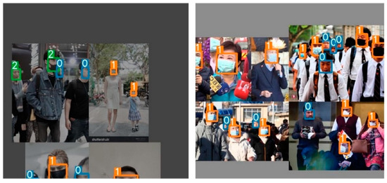 The dataset in this paper consists of the open-source dataset RMFD [32], AFLW, and a web crawler. The dataset includes densely populated areas such as streets and subways, enhancing the number of small-scale and dense targets. The final data set contains 3010 images after screening, cleaning, and other procedures, including 2410 images in the training set and 600 in the validation set. The dataset is annotated in the YOLO format using the tag program LabelImg, with three labeling categories: face, mask, and mask incorrectly. The sample distribution of different categories in the dataset is shown in Table 2, where objects represent the number of instances.