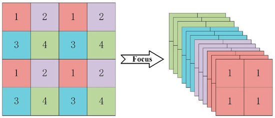 The backbone part uses the Focus down-sampling, improved BottleneckCSP, and Spatial Pyramid Pooling (SPP) structures to extract feature information of the image. The input RGB image is first split into four parts for two-times down-sampling, then spliced in the channel dimension by the Concat module to obtain a 12-dimensional feature map, which is then sent to the convolution module for feature extraction using a 3 × 3 convolution kernel, obtaining a 32-dimensional feature layer. As shown in Figure 3, Focus down-sampling reduces the size of the feature map by increasing its dimension without sacrificing any information and enhances the network’s performance.