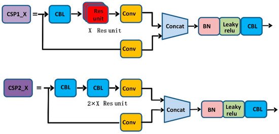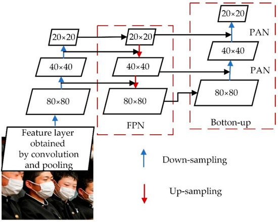 The CSP2_X structure is used in Neck to improve the network’s feature fusion capability by inserting two residual blocks, which allows the network to reduce computation while maintaining richer feature information. The Neck layer comprises Feature Pyramid Networks (FPN) and Path Aggregation Networks (PAN) [31], as shown in Figure 6. The FPN conveys deep semantic features from top to bottom, whereas the PAN transmits the target’s position information from bottom to top. The model transfers feature information of objects of different sizes through the fusion of top-down and bottom-up feature information, which solves the problem of multiscale object detection.