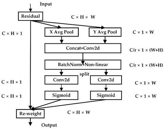 Figure 7 depicts the CA mechanism implementation process. The input feature maps are pooled globally and averaged from both width and height directions to obtain feature maps in both width and height directions. The calculation formulas are as follows:
