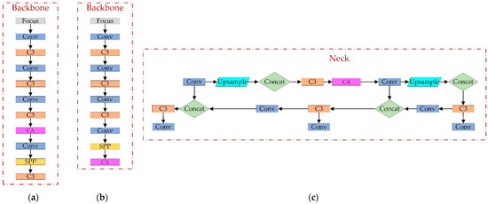 Location of CA additions. (a) CA added between C3 and Conv of Backbone; (b) CA replaces the last C3 layer of Backbone; (c) CA added between C3 and Conv of Neck.