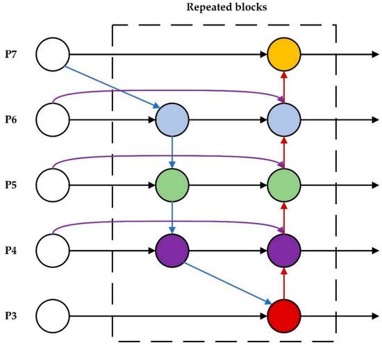 The Bidirectional Feature Pyramid Network (BiFPN) is a typical complex two-way feature fusion pyramid structure. First, BiFPN streamlines the feature network by deleting intermediary nodes with only one input edge, based on the standard feature pyramid. Second, extra edges are added at the same level between the input and output nodes to fuse more features at a low cost. Finally, BiFPN treats each bidirectional (top-down and bottom-up) path as a single feature network layer and repeats the same layer multiple times to enable higher-level feature fusion. As seen in Figure 9, P3–P7 in the figure represent the fusion features of different levels. Blue arrows indicate the top-down pathway, red arrows indicate the bottom-up pathway, and purple arrows indicate the addition of additional edges to input and output nodes that are on the same level.