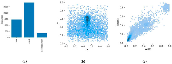 Figure 11 depicts the visualization results of the dataset analysis, where (a) represents the distribution of object categories in the dataset, (b) represents the distribution of object centroid locations, with the horizontal and vertical coordinates indicating the location of the centroids, and (c) represents the distribution of object sizes, with the horizontal and vertical coordinates indicating the width and height of the objects.