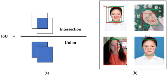 IoU calculation and applications. (a) IoU calculation example diagram; (b) dividing samples according to IoU thresholds.