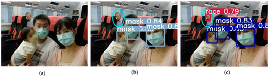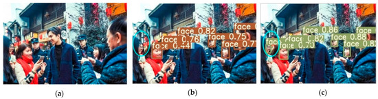 Several images from the dataset were chosen for testing to verify the model’s viability, and the accompanying figure shows the detection results of the YOLOv5-CBD and YOLOv5 algorithms in different scenarios. Figure 14 shows the recognition of the occluded target, where the face occluded by the seat is not detected in Figure 14b, but the occluded target is detected in Figure 14c. Figure 15 shows the detection of cross-dense targets with overlapping face targets is missed in Figure 15b and correctly detected with higher accuracy in Figure 15c. Figure 16 shows a station with dense targets, and it can be observed from Figure 16b,c that the improved algorithm can better detect and identify small-scale targets for long-range. Figure 17 shows the target detection in a low-light scene, where Figure 17b misses the faces in dark areas and Figure 17c correctly detects more targets.