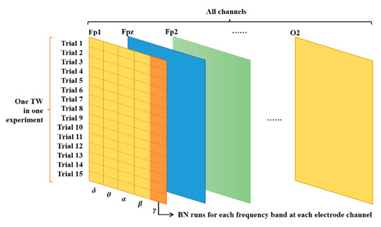 where Fi and FBNi represent the original value of a specific feature and the value of the feature with ELBN in an experiment, respectively, while Fmin and Fmax represent the minimum and maximum values of the corresponding feature in the same experiment, respectively. Features extracted from one frequency band in one channel are calculated in each trial, and the features from all 15 trials in the same experiment are normalized following Formula (1). The normalization occurred across 15 trials in one experiment. Each trial can provide one feature from one frequency band in one channel when using a selected TW, and then the 15 trials contribute to the 15 features for normalization. As for the 180 s TW where there is just one TW, the normalization will be performed one time in one experiment with the minimum and maximum values across the 15 trials. Our proposed ELBN is conducted within an experiment to avoid interference or noise from other factors (e.g., change of body status in different experiments), which is newly developed to solve the individual difference and baseline deviation problems in the collected data from different subjects on different days. The protocol of ELBN is shown in Figure 3. Although this idea seems simple, to the best of our knowledge, it has never been used in the previous emotion recognition studies based on EEG signals.