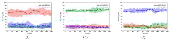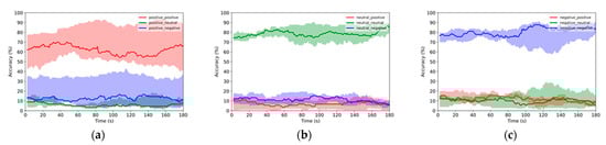 A 2-s sliding TW with a 1-s step was used for online emotion recognition with the LR classifier. The 10 random sets were used with 540 × 10 samples for training and 135 × 10 samples for testing, where 540 and 135 are the numbers of samples for training and testing, respectively, in one random set, and the number 10 means that there are 10 random sets. In total, 675 × 10 × 179 TWs (i.e., total samples in one random set × total number of sets × TWs used in one sample) were used to examine the online emotion recognition performance, and the mean accuracy of the testing samples was used as the final output. The results when using PSD features or DE features are illustrated in Figure 4 and Figure 5, respectively. The obvious distance between the red area and blue/green areas in Figure 4a indicate that the positive emotion samples can be correctively recognized without being mistakenly recognized as neural or negative emotion samples. Larger gaps can be found in Figure 4b,c indicating that the neural and negative emotion samples can be more easily recognized without confusing them with the other emotion samples. Similar trends can be found in the results on DE features in Figure 5. These results show that the 2-s TW can be successfully used for online emotion recognition based on EEG signals with ELBN.