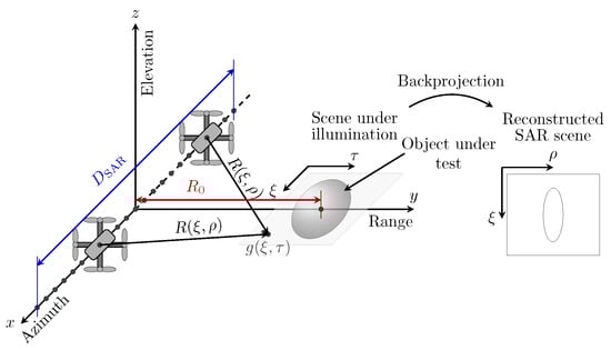 Problem setup. Representation of a UAV-based THz SAR imaging system. Here, denotes the reference (minimal) range distance between the platform antenna and the center of the object located in the scene under illumination.
