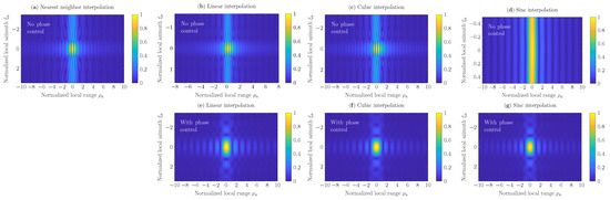 Reconstructed SAR scenes h of pixels with nearest neighbor, linear, cubic, and sinc interpolations: (a–d) without the phase-control procedure; (e–g) with the phase control procedure. Here, the sampling rate .