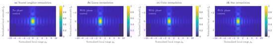 When the sampling rate is twice higher, i.e., , the point target can be reconstructed accurately with all the interpolation methods discussed in this paper, as shown in Figure 3a–d. However, the azimuthal and some minor range distortions are still observed over the normalized range interval , when the nearest neighbor approach is used; see Figure 3a. Note that the upsampling procedure for the nearest neighbor interpolator can be provided through the FFT interpolation, the computational complexity which is , where , , is the upsampling factor, the number of range samples. It has been investigated that for upsampling factors , the computational complexity of the FFT interpolation becomes dominant over the computational complexity of the global backprojection algorithm. This fact demonstrates additional advantages of the extended interpolators, which provide the opportunity to avoid the FFT-based upsampling procedure, in terms of computational costs and memory resources. It should also be noted that the kernel of the sinc interpolator used in this numerical example is truncated to normalized sinc functions, where and based on which the reconstruction results are accurate; see Figure 2g and Figure 3d. Nevertheless, the optimal length of the kernel has to be investigated.
