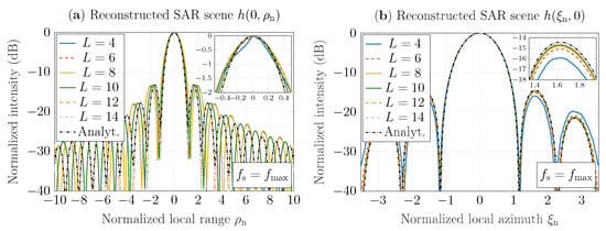 Figure 4a,b depict SAR-scene cuts reconstructed by the GBP algorithm that involves sinc interpolation, as well as SAR-scene cuts obtained based on the impulse response function (A1), which is defined in Appendix A, for and , respectively. The scene cuts are plotted as functions of the normalized range (for ) and the normalized azimuth (for ), respectively, where the intensity is normalized with the peak intensity value. Here, the sampling rate , the range and the azimuth are normalized similarly as in the example described above, and the kernel is truncated to the length , where . It has been observed that for , the reconstruction results converge both for range and azimuth SAR-scene cuts. Furthermore, the results have a good agreement with the solution based on the approach (A1) in range and azimuth directions. It should be noted that intensity deviation in the third sidelobe, which is observed in Figure 4b, can be reduced by increasing the sampling rate . Hence, the sinc interpolator with the kernel truncated up to normalized sinc functions, where , is sufficient to obtain accurate interpolation results. Therefore, let the truncated sinc interpolator (25) for be defined as the sinc interpolator and used in the rest of the paper.